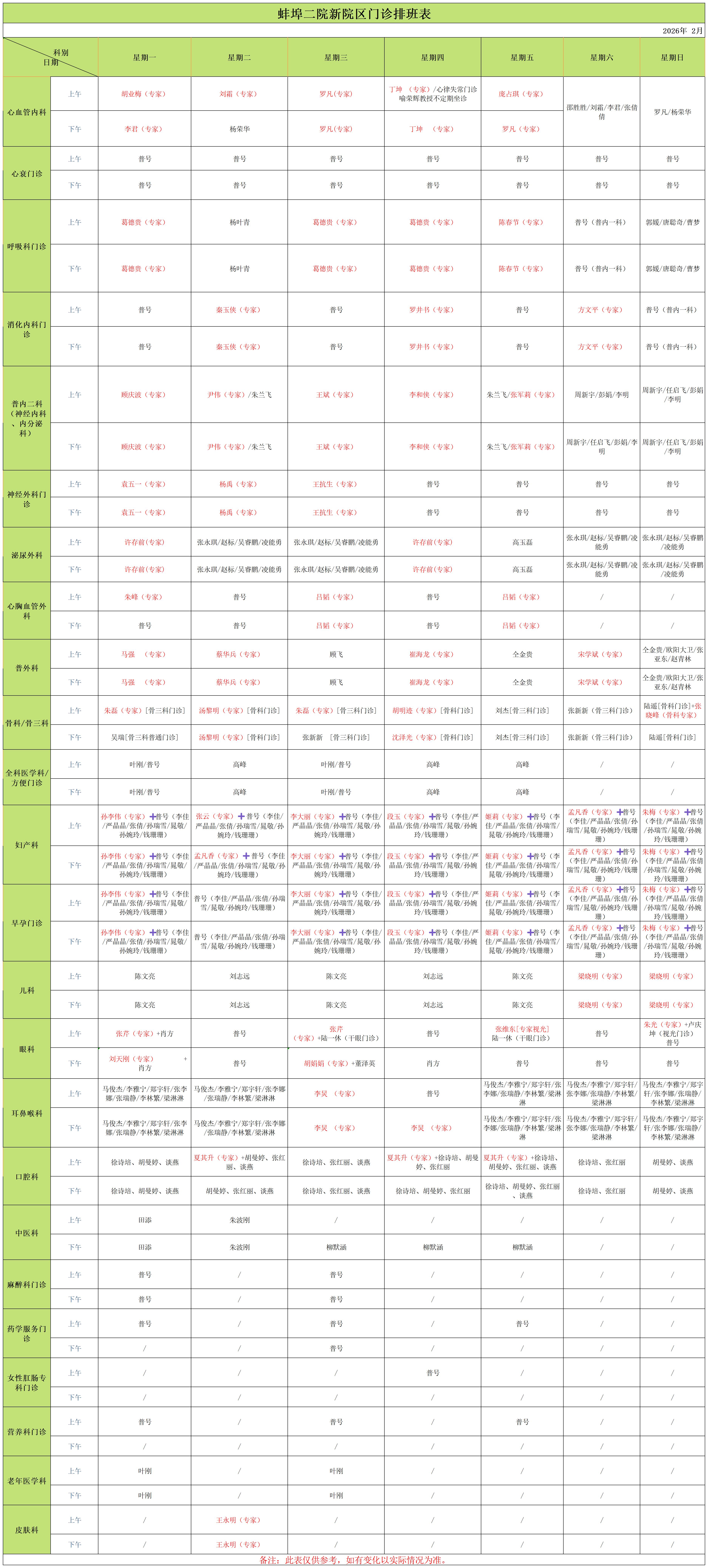 新院区二月门诊排班表