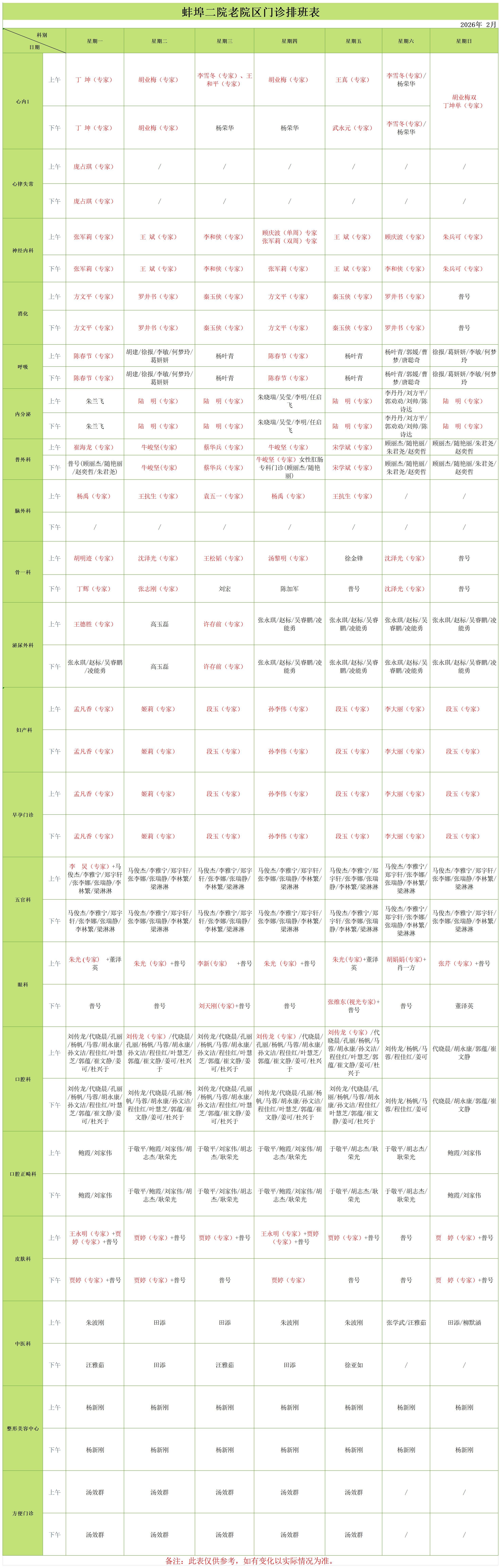老院区二月门诊排班表