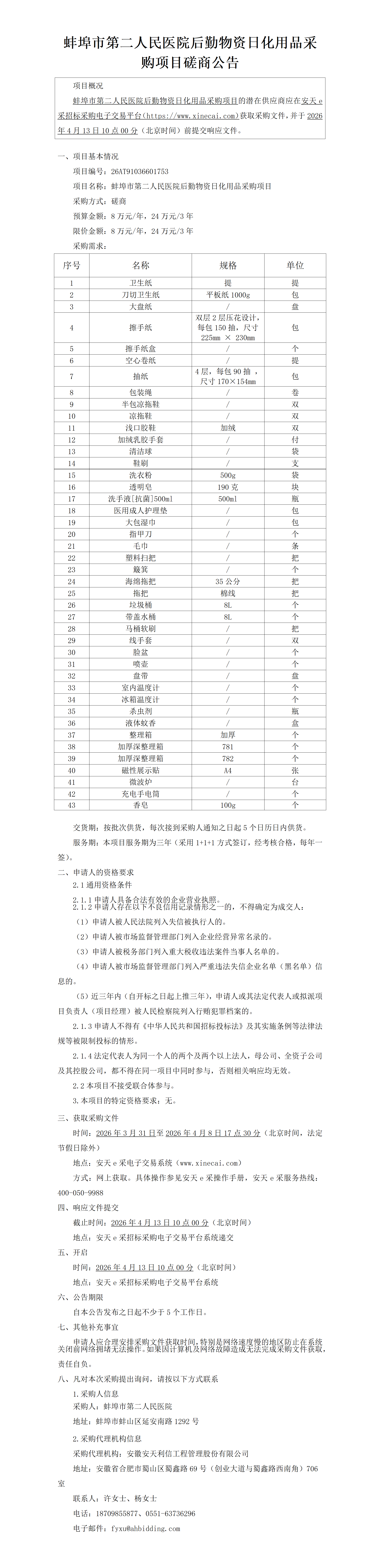 蚌埠市第二人民医院后勤物资日化用品采购项目磋商公告