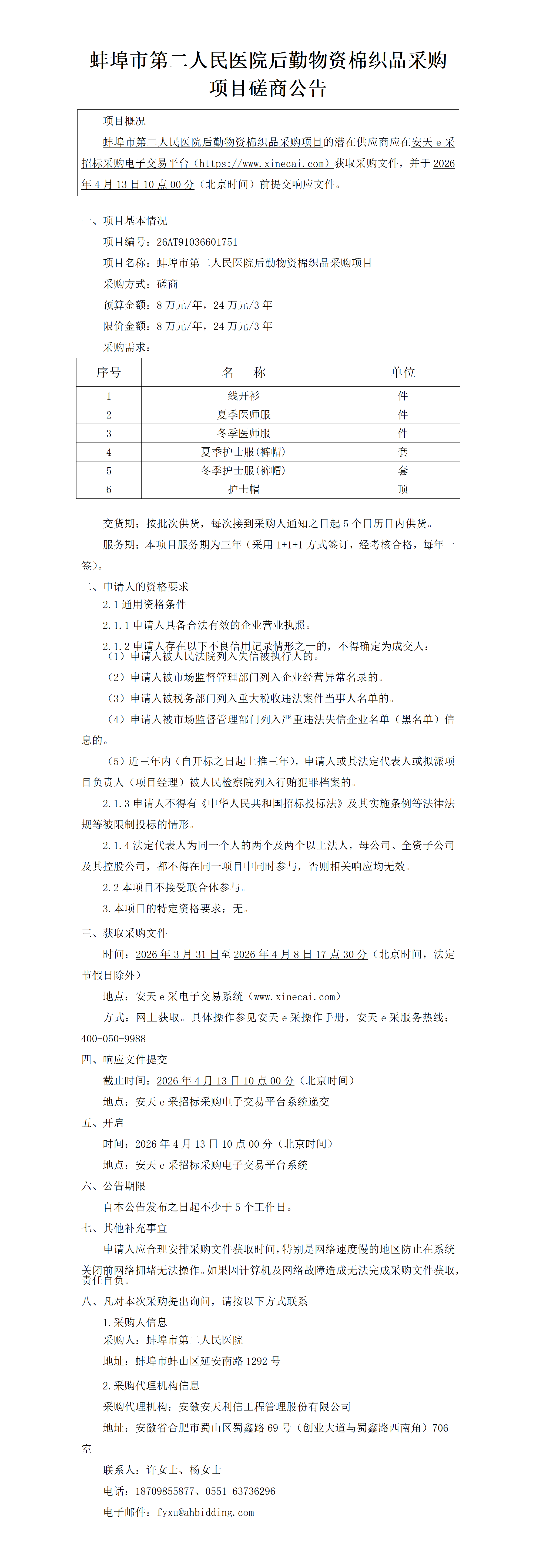 蚌埠市第二人民医院后勤物资棉织品采购项目磋商公告