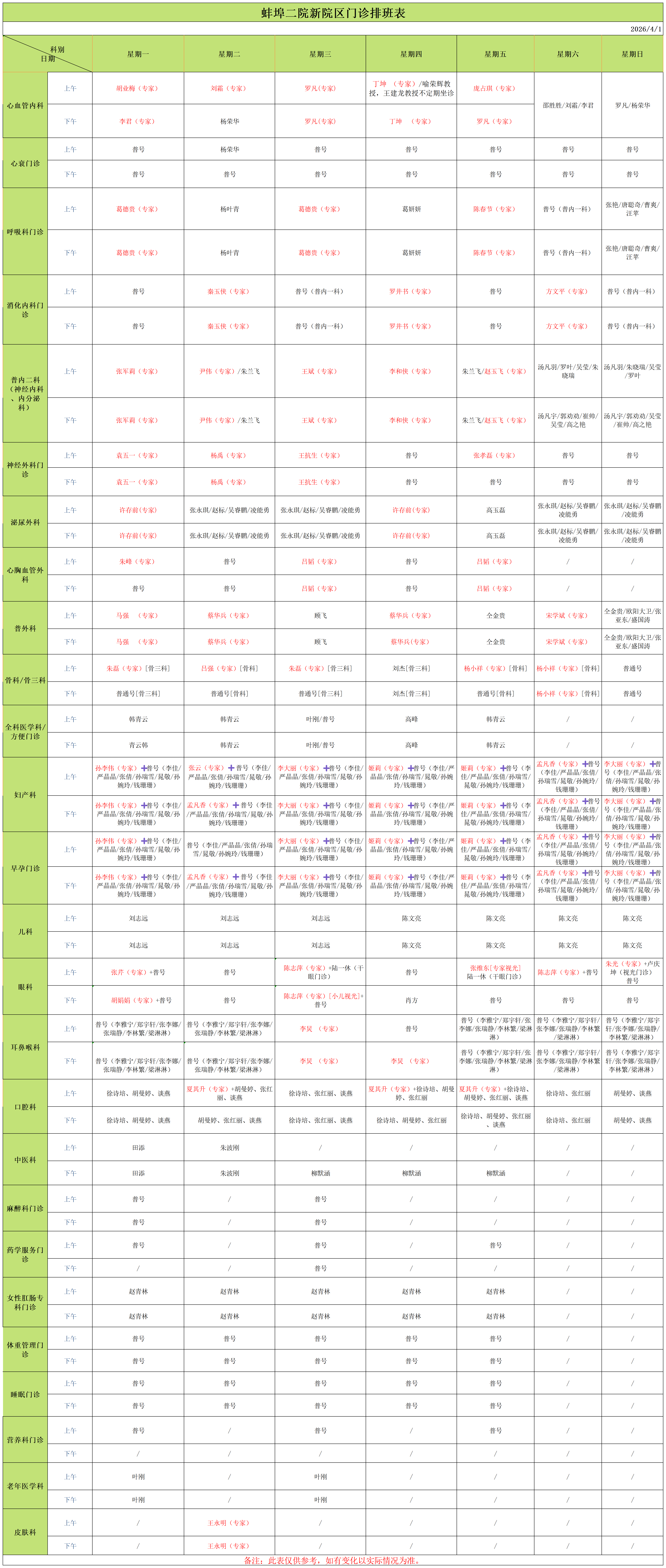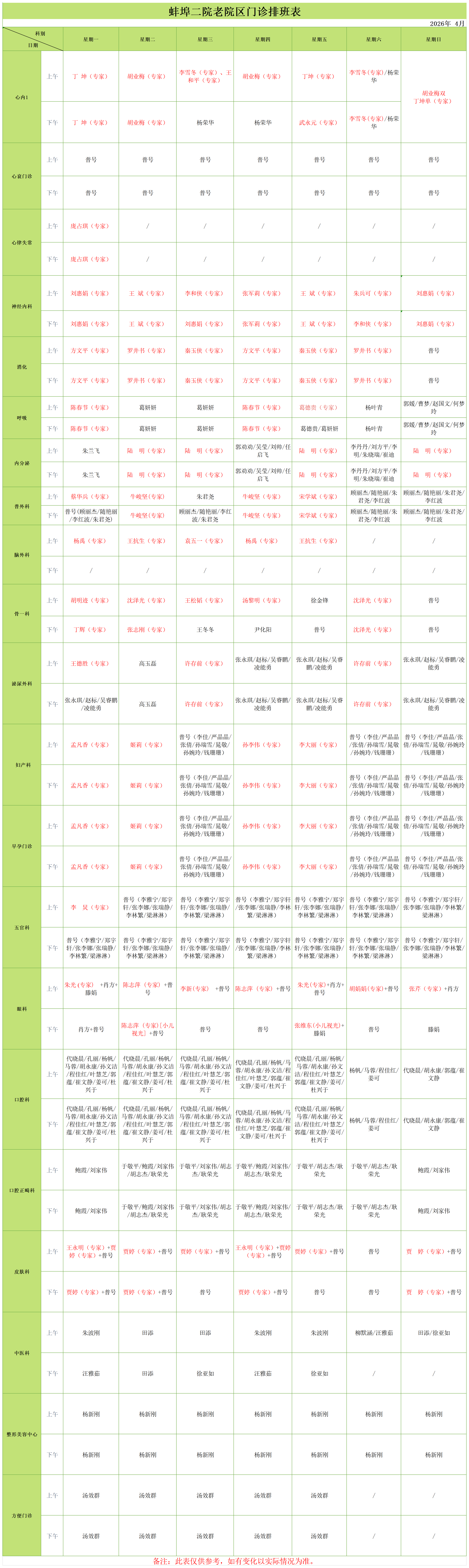 老院区四月门诊排班表